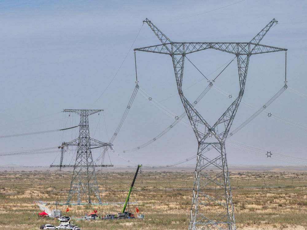 ??2025年7月13日,在塔里木盆地南緣的新疆和田地區民豐縣,隨著牽引機將最后一段電線成功從183號鐵塔拽至188號鐵塔,歷時15年建設的環塔里木盆地750千伏輸變電工程全線貫通(無人機照片)。新華社記者 丁磊 攝