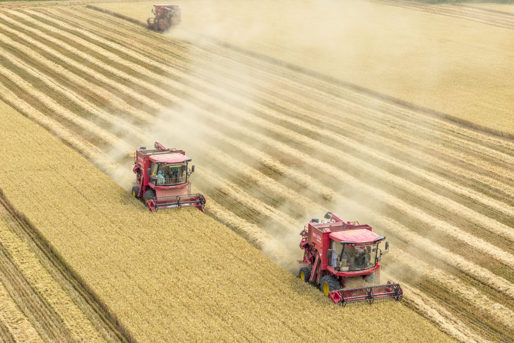 ??2025年6月9日,河南省三門峽靈寶市西閻鄉東古驛村村民在搶收小麥(無人機照片)。新華社發(杜杰 攝)